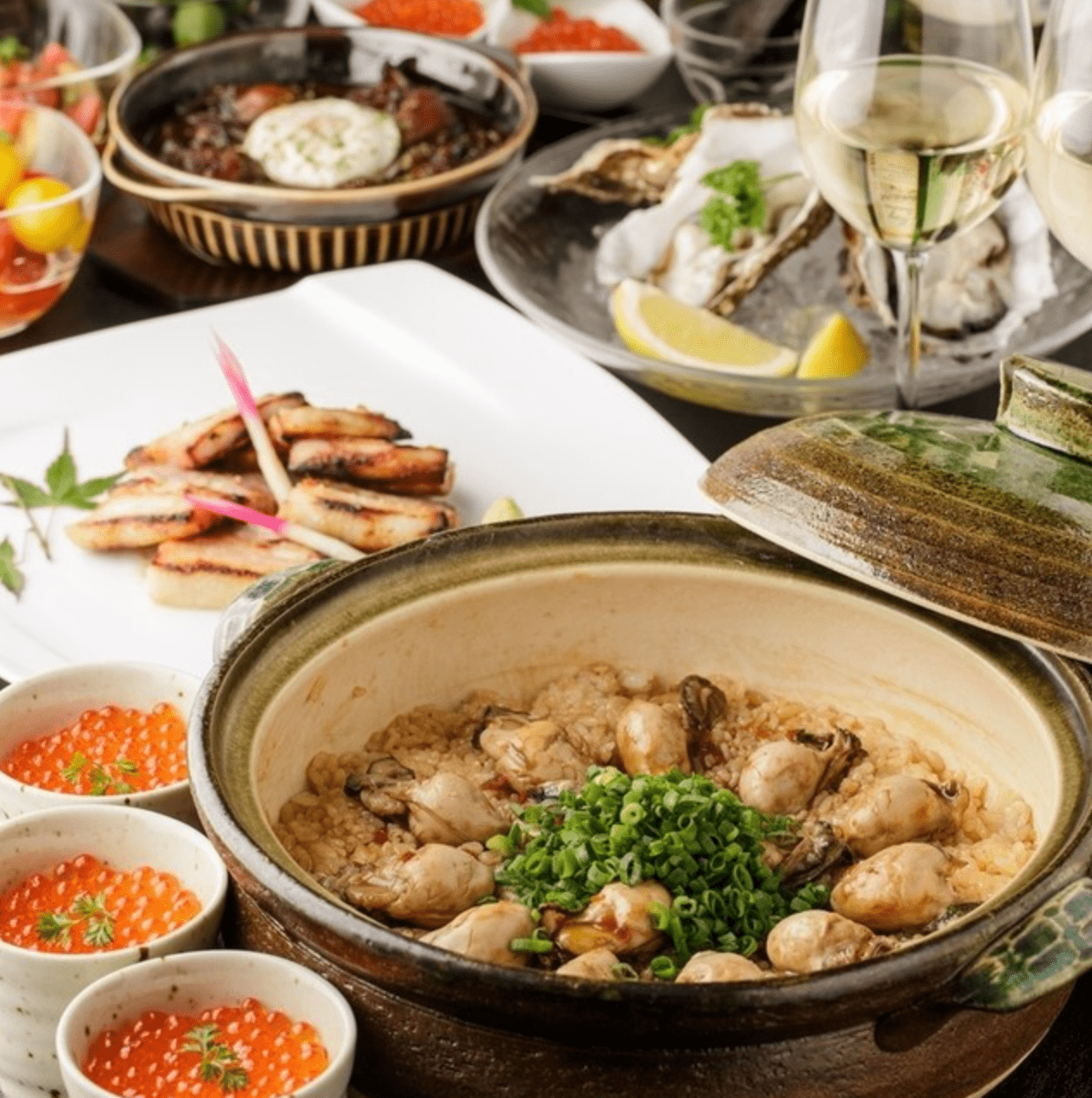 牡蠣、いくら、鮭ハラスの中からいずれか2つの具材を選んでいただき、ご注文戴いてから土鍋で炊き上げる一品です。具材の味と香りが、香ばしいおこげが、お酒のあとの締めにも、お酒を飲まないお客様のメインにもぴったりです。